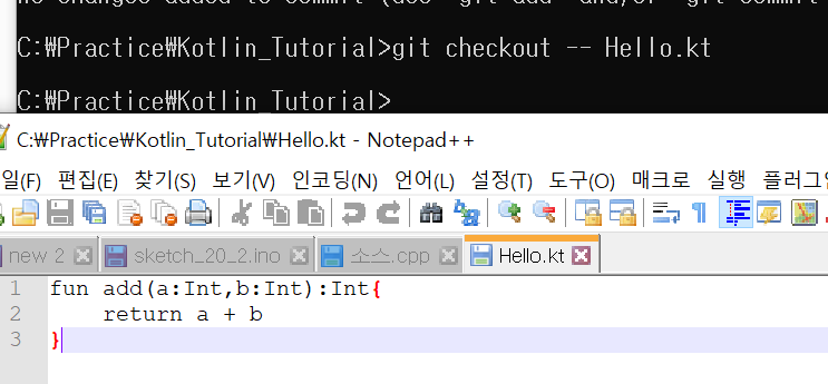 git checkout -- 명령어는 수정된 내용을 원래대로 되돌리는 명령어 입니다.